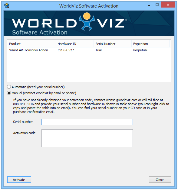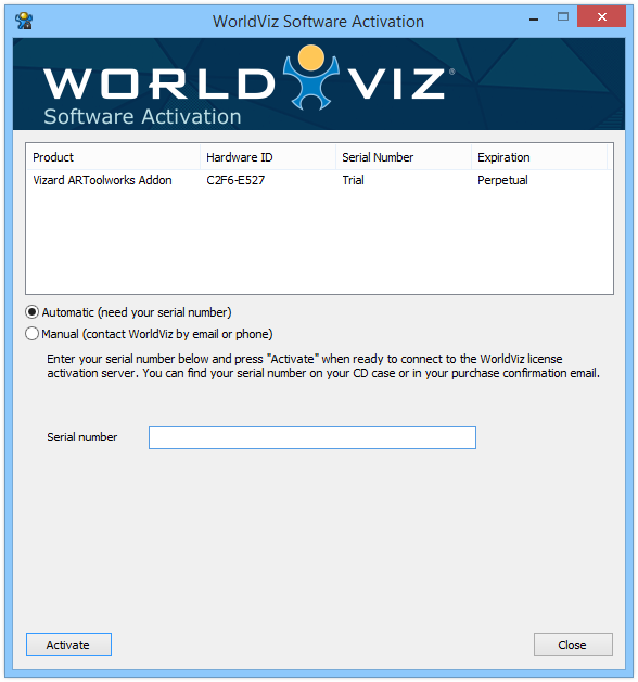 The expiration value will change to "Perpetual". The activation process is now completed and the "WorldViz Software Activation" can be closed.