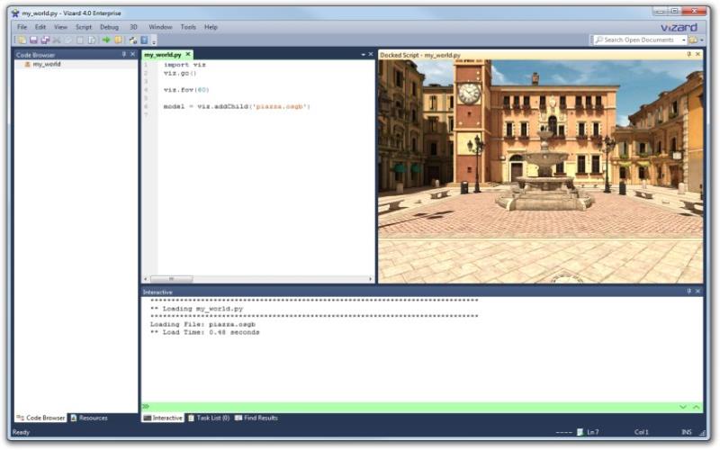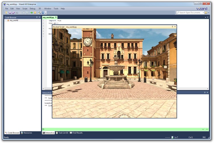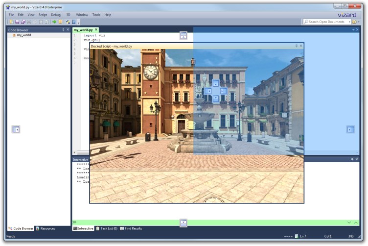 The Vizard graphics window can be docked within the IDE when a script is run. Simultaneously running a program and being able to access other windows within the IDE can facilitate development. Commands can be entered in the Interactive window or the debugger can be run without having to minimize or move the graphics window: